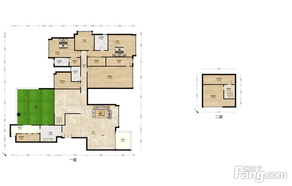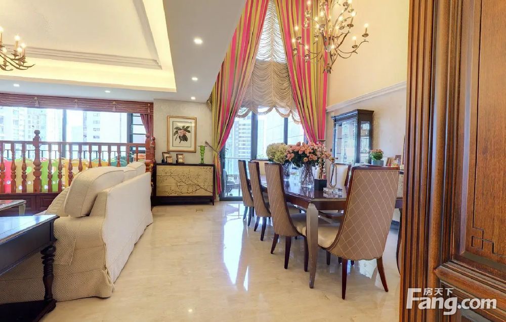 此户型实得面积350平米,带一个50多平的。大横厅看小区中庭,东南朝向