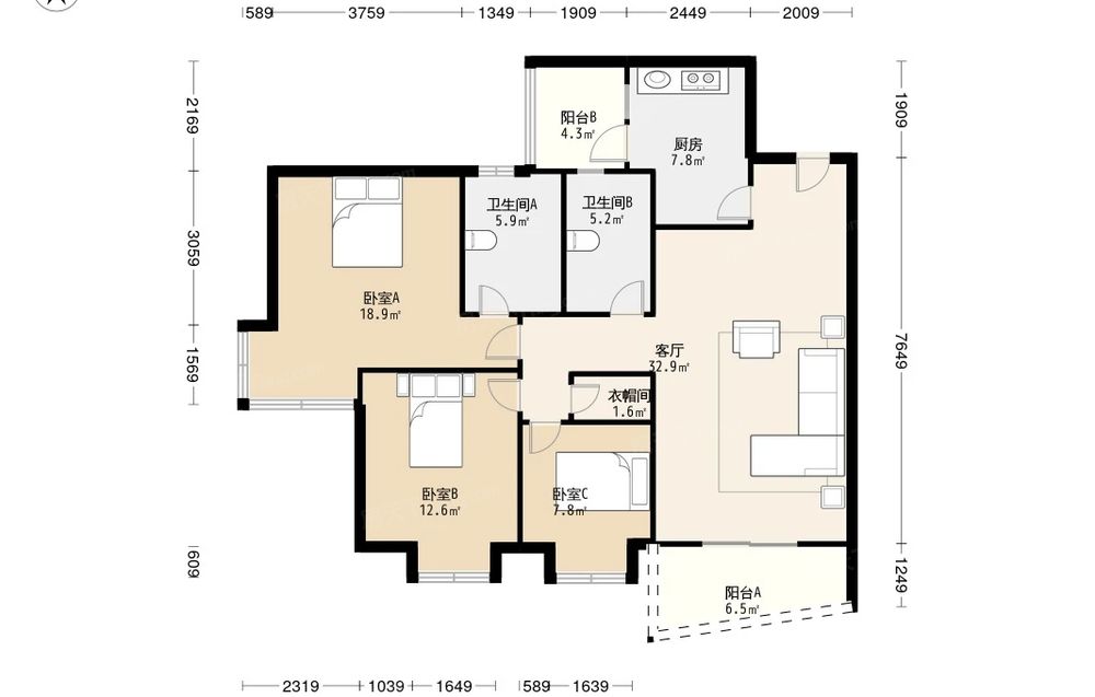 万达锦华城 3室2厅 南
