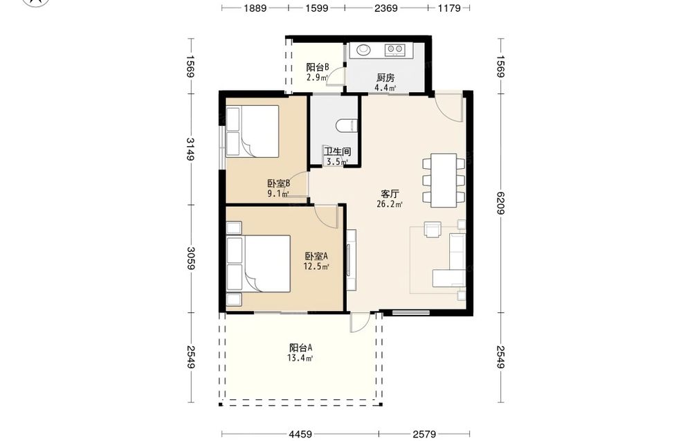 • 当前房源报价为:59.50万