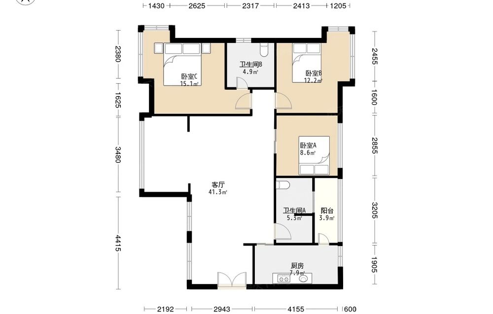 桐梓林壹号 3室1厅 西南 东北