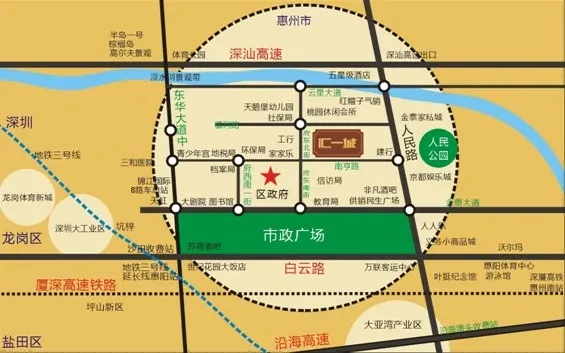 交通:2条轨道交通:厦深高铁、地铁三号线延长线;3条深惠干线:深汕高速、深汕公路、东部沿海高速;4条公交线路:深惠城巴2号线(惠阳汽车客运总站往返龙岗汽车站),8路(惠阳天虹往返大亚湾澳头),K1(惠州火车站往返大亚湾澳头),201(惠阳区政府往返大亚湾霞冲);学校:惠阳汤普幼儿园、半岛崇雅中心幼儿园,惠阳区第八小学、崇雅中学、惠阳区第四中学,商场:天虹商场、小商品城、惠阳步行街医院:惠阳三和医院、惠阳中医院、惠阳人民医院其他:规划:惠阳大剧院、市政广场、体育公园、棕榈岛高尔夫、淡水河景观带